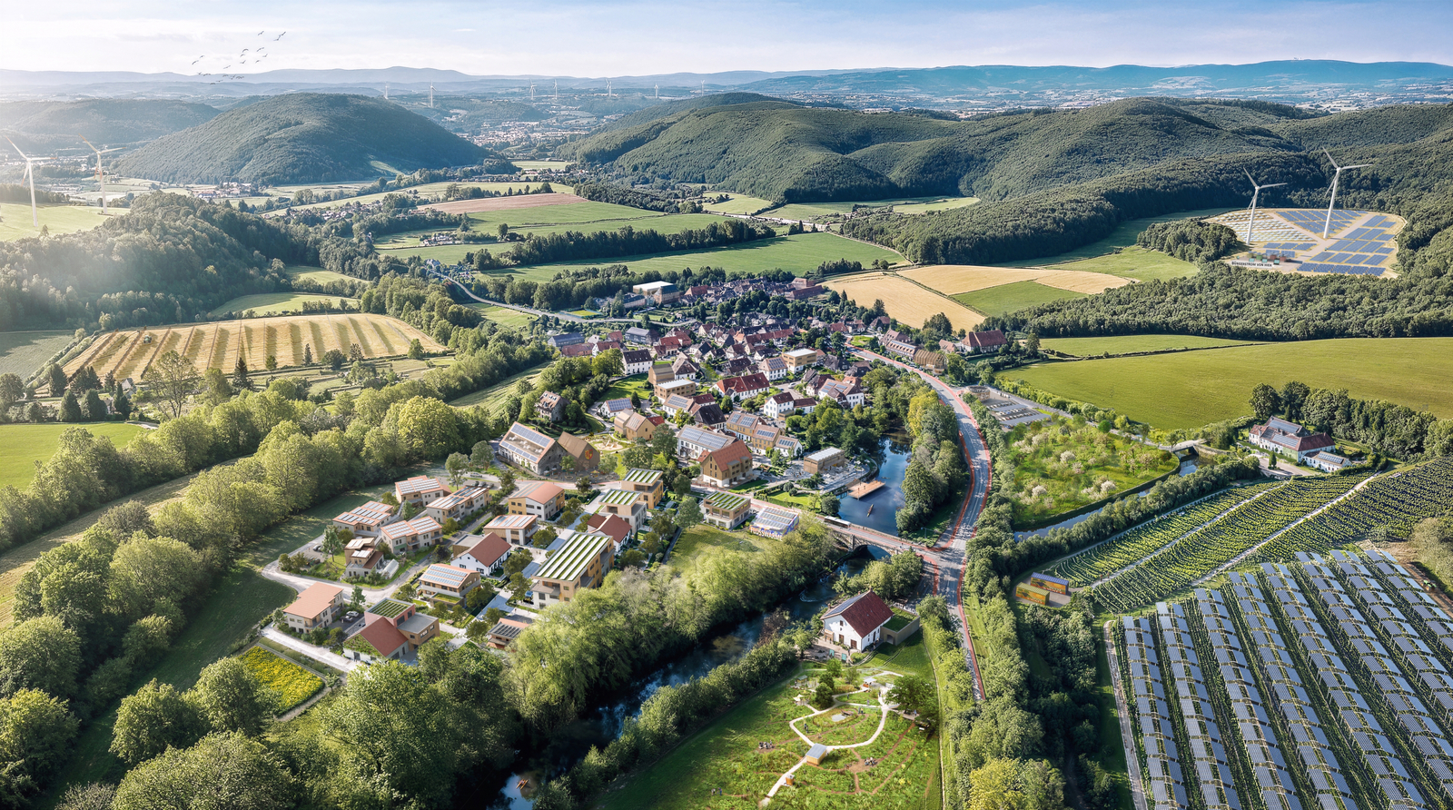 Unser interaktives Zukunftsbild zeigt eine fiktive ländliche Kommune von morgen – als Inspiration für echte Veränderungen.