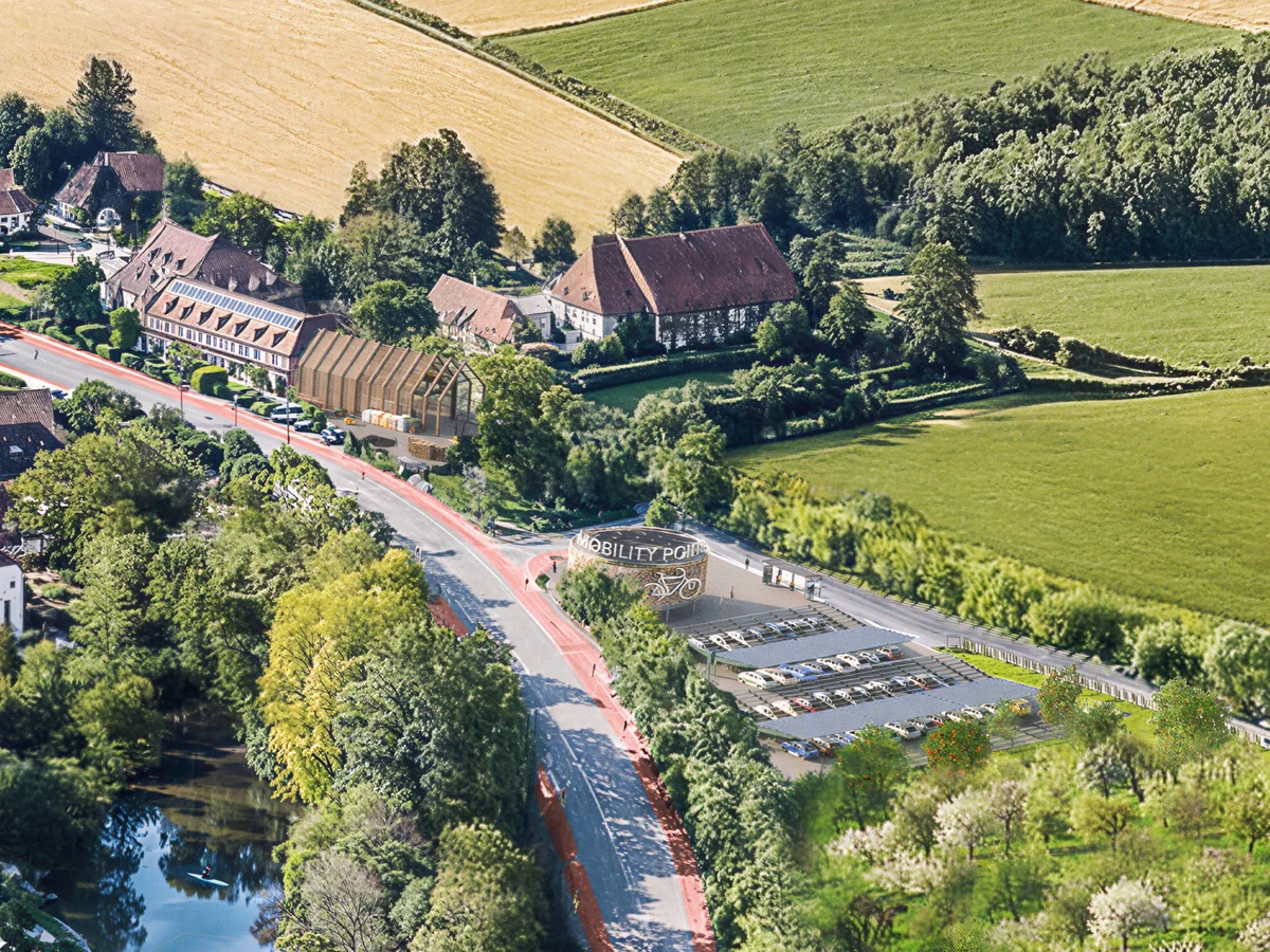 Eine zentrale Mobilitätsstation mit Fahrradstellplätzen, Bushaltestelle und einem PV-überdachten Parkplatz bündelt die Mobilitätsangebote. Ergänzt durch ein gemeinschaftliches Dorfauto und Radwege wird so eine vernetzte, umweltfreundliche Infrastruktur geschaffen, die Mobilität und Teilhabe für alle ermöglicht, den Umstieg auf klimafreundliche Verkehrsmittel erleichtert und die Lebensqualität nachhaltig verbessert.